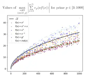 - суммы мультипликативных характеров[29] по множеству (функция означает дискретный логарифм, а параметр соответствует выбранному характеру):
