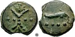 - Roma Æ Aes Grave. Testa di cavallo dx; quattro globuli sotto. / Testa di cavallo sin., quattro globuli sotto. *Crawford 18/3.Roma. ca 225—217 a.C.. Æ Aes grave Triente. Testa di Minerva sin. / Prua di nave, quattro globuli. Crawford 35/3a; Haeberlin pl. 17, 6-19.