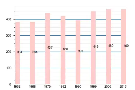 | 1962 | 1968 | 1975 | 1982 | 1990 | 1999 | 2006 | 2008 | 2011 | 2012 | 2013 |
