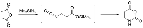 При присоединении триметилсилилазида к ангидридам карбоновых кислот образуется равное количество силилового эфира и изоцианата. Циклические ангидриды также присоединяют триметилсилилазид, однако в их случае образуются ω-триметилсилилоксикарбонилизоцианаты, которые далее циклизуются 1,3-оксазин-2,6-дионы.