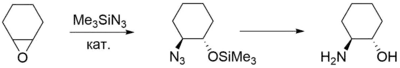 Также триметилсилилазид присоединяется к оксиранам, давая β-триметилсилилоксиазиды, которые являются предшественниками β-аминоспиртов. Реакция катализируется хлоридом цинка, комплексами ванадия и титана, тартратом цинка и изопропоксидом алюминия. От катализатора зависит селективность процесса. Подобный процесс описан также для раскрытия азиридинов, которое позволяет получать 1,2-диамины[1].