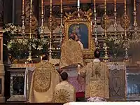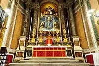 Главный алтарь с четырьмя колоннами из африканского мрамора по сторонам (по две с каждой стороны) был создан в 1616 году Доменико Поцци. Алтарная картина представляет Новозаветную Троицу (Распятие с Богом Отцом, Святым духом и ангелами) и является работой Гвидо Рени. Картина написана летом 1625 года по заказу куриального кардинала Людовико Людовизи, племянника папы Григория XV [2].