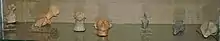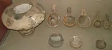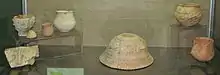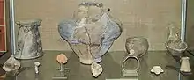 Керамика. Посуда представлена тремя видами. Кухонная посуда (для хранения продуктов и приготовления пищи) с примесью шамота, песка, кварцита, плохо обожжённая: широко открытые котловидные горшки, большие горшки-корчаги с цилиндрической горловиной, миски, невысокие круглые жаровни с прямым бортиком, большие конические тазы, грубые толстостенные сосуды с шероховатой поверхностью, фруктовницы — неглубокие тарелки на полом цилиндрическом поддоне. Половина кухонной посуды была без орнамента, остальная украшена одним-двумя рядами наколов, насечек и налепов. Столовая посуда изготовлена из хорошо промешанной глины с добавлением песка, равномерно обожжена, заглажена, покрыта ангобом и подлощена: горшки с округлым или приземистым туловом, грушевидные, кувшиновидные и цилиндрические сосуды, чашки, неглубокие тарелки, черпаки, крышки шлемовидных и конических форм, небольшие глиняные ложки часто с плоской широкой ковшовой ручкой. Украшена каннелированным углубленным спиральным или ленточным орнаментом и штамповым орнаментом в виде насечек, налепов. Свободные части сосудов заштрихованы полосами и округлыми углублениями. Много сосудов с округлым телом на подставке (или ножке) с небольшим отогнутым краем, украшенные орнаментом до самого дна; ручки — небольшие на сильно выступающих плечиках, другой вид ручек — горизонтально проткнутые выступающие бугорки на стенках сосудов или сделано округлое сквозное отверстие. Поверхность третьего вида посуды хорошо заглажена, покрыта ангобом, подлощена и богато орнаментирована. Реже эта керамика тщательно обработана и изнутри. Она представлена профилированными неглубокими тарелками, округлыми вазами на полом цилиндрическом поддоне, горшками с округлым или слегка приземистым туловом и невысоким венчиком. Встречается тонкостенная керамика с полированной поверхностью, в том числе одиночные и двойные биноклевидные сосуды. Все сосуды богато орнаментированы. Расписной керамики не было обнаружено. Много схематизированных статуэток, изображающих женщин, реже мужчин в сидячем, полусидячем и стоячем положениях, а также зооморфные фигурки и глиняные модельки жилищ[16][17].