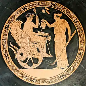Триптолем (др.-греч. Τριπτόλεμος, лат. Triptolemus) — герой цикла элевсинских и аттических мифов о Деметре, сын элевсинского царя Келея и Метаниры (по Овидию и Нонну) (либо Кофонеи, либо Гионы, либо Деиопы). По аргосской версии, сын Трохила[3]. По Паниасиду, сын Элевсина[4]. По Орфею, сын Дисавла. По версии, сын Геракла и Полигимнии[5]. По Ферекиду Афинскому и Мусею, сын Океана и Геи[6]. В трагедии Херила «Алопа» рассказывается, что Керкион и Триптолем были братьями, что их родила дочь Амфиктиона, что отцом Триптолема был Рар, а Керкиона — Посейдон[7].