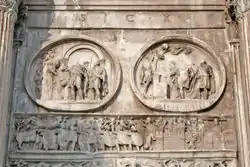 На аттике попарно расположены восемь барельефов, снятые с неизвестного памятника эпохи Марка Аврелия (161—180), вероятно триумфального монумента в честь войны с сарматами (169—175). По северной стороне слева направо изображаются: возвращение императора в Рим из военного похода, император покидает город и приветствуется персонифицированной Via Flaminia, император раздаёт деньги народу, император допрашивает пленного германца. По южной стороне (также слева направо): перед императором предстаёт германский вождь, другие пленники, император обращается к войскам, император приносит в жертву богам свинью, овцу и быка. На барельефе с раздачей денег народу остались следы удалённой фигуры сына Марка Аврелия Коммода.