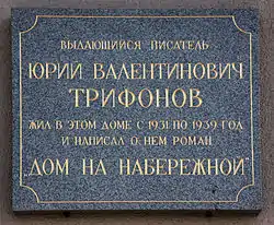 В 2003 году на доме была установлена мемориальная доска: «Выдающийся писатель Юрий Валентинович Трифонов жил в этом доме с 1931 по 1939 год и написал о нём роман „Дом на набережной“»[10].