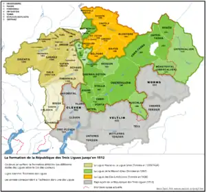 ![]() Три лиги в 1512 году: Лига десяти сообществ (оранжевый), Лига дома Божьего (зелёный) и Серая лига (коричневый). Серым цветом указаны утраченные территории. |