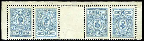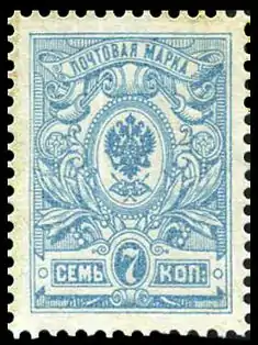 В 1908—1909 годах в обращение поступили новые стандартные марки Российской империи 17 выпуска, заменившие знаки почтовой оплаты выпусков 1889—1905 годов. Новые марки отличались рисунками и бумагой, а также тем, что покрывались контрольной меловой сеткой. В числе первых в декабре 1908 года была выпущена наиболее употребительная марка 7-копеечного достоинства. Вскоре после того, как она поступила в продажу, было обнаружено, что в отдельных листах встречаются по три марки с некоторыми отступлениями в рисунке.