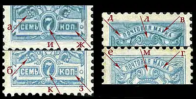 | Орнамент левой части ленты с надписью «Почтовая марка» | 3 чёрточки (д) | 2 спиральные виньетки (е) |
