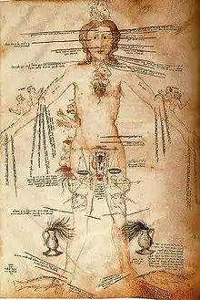 Средневековые концепции старения и долголетия основывались в значительной степени на достижениях древнегреческой философии. Аристотель в трактате «О возникновении и уничтожении» постулировал конечность и линейность существования «подлунных» субстанций. С другой стороны, в сочинении «О небе» он заявил, что всякое уменьшение, в том числе старение, противно природе. Наконец, в трактате «О возникновении животных» Стагирит назвал болезни источником старости, а старость — естественной болезнью; последний тезис у римского поэта Теренция принял форму афоризма «Старость — сама по себе болезнь» (лат. Senectus ipsa morbus est). У христианских авторов и у неоплатоников старение рассматривалось как следствие человеческой греховности[50]. Возрастные физиологические изменения в древней и средневековой медицине объяснялись в рамках теории темпераментов. Развивая метафору Аристотеля о лампе, выгорание масла в которой уподобляется исчерпанию жизненных сил, врачи гиппократовской школы говорили о «внутреннем тепле» (calor innatus) организма, постепенно угасающем с возрастом. Относительно того, что больше соответствует старости, сухость или влажность, существовали разные точки зрения. Фактор сухости в процессе старения для врачей школы Гиппократа аналогичен осеннему увяданию растений. О сухости красноречиво напоминает фактура кожи старческих рук, и потому Гален называл жизнь постоянным высыханием, с рождения и до смерти[51]. Таким образом, к старению согласно классической медицине приводят угасание внутреннего тепла, утрата жизненной влаги (humidium radicale) и накопление продуктов распада (partes terrestres). Влажности в средневековой медицине приписывалось принципиальное физиологическое значение. Происходя из семени (humiditum primigenium), влажность постоянно расходуется — по мнению Фичино, вследствие опасного перегревания[52].