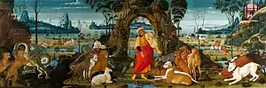 К вопросу взаимосвязи между космическим порядком и теорией музыки Фичино обращался неоднократно, но наиболее полно вопрос раскрыт в комментариях к «Тимею»[70]. Значительная часть комментария посвящена толкованию платоновской интерпретации музыкальной теории пифагорейцев. Основным её постулатом является тезис о том, что числа могут быть выражены музыкальными нотами и звуками и что их отношения могут быть гармоничными и благозвучными. В результате, как полагает Фичино, появляется возможность средствами музыки перенести идеи из интеллигибельного мира в мир чувственных восприятий. В понимании Фичино музыка является одновременно набором звуков и числовых отношений, причём каждый способ восприятия имеет свои эстетические критерии[71]. Изложенный в «Тимее» космогонический миф (35—36) Фичино рассматривает в христианской перспективе, описывая Бога как мудрого архитектора, упорядочивающего вселенную и постоянно поддерживающего в ней порядок. В ходе акта Творения гармонический архетип впечатался в материю, и первоначальный хаос был преобразован в гармонию четырёх элементов. Числовым пропорциям, приводимым Платоном, Фичино придаёт смысл «меры, числа и веса» (Прем. 11:21). Вслед за Проклом Фичино полагает, что Бог связан с космосом динамически, «выпевая» его. Сам же космос может быть истолкован как торжественное песнопение в честь Создателя[72]. Объясняя композицию мировой души, философ уделяет особое внимание приводимым Платоном числовым рядам, «плоским» (1-2-4-8) и «объёмным» (1-3-9-27). Расположенные графически в виде «платоновской лямбды» или «дельты Крантора», они образуют треугольник с вершиной в единице, обозначающей Бога как Первопричину. Применительно к теории контрапункта простейшая из пропорций 2:1 означает октаву, 3:2 квинту, 4:3 кварту и т. д.[73] Далее Фичино приходит к выводу, что природные явления в макрокосме являются подражанием определённой математически небесной гармонии микрокосма, а законы физического мира те же, что управляют высшими сферами. Важную роль его в построениях играют населяющие небесные сферы «демоны», подражающие в своих движениях звёздам и планетам[74].