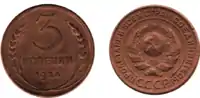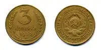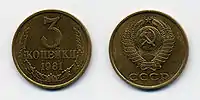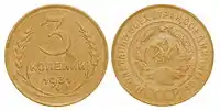 С 1926 по 1957 год 3-копеечные монеты выпускался в более прочном и технологичном медно-алюминиевом сплаве жёлтого цвета, а с 1961 по 1991 год происходила чеканка из латуни. После 1991 года чеканка монет номиналом 3 копейки в России более не возобновлялась.