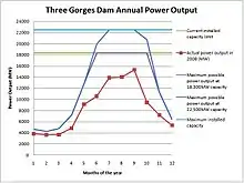 Во время сухого сезона с ноября по май мощность производства электроэнергии ГЭС ограничена объёмом потока реки, что видно на диаграммах справа. При наличии же достаточного потока, выходная мощность ограничена возможностями генераторов. Максимальные кривые мощности были рассчитаны на основе среднего расхода, при условии, что уровень воды составляет 175 м, а валовая эффективность энергоузла — 90,15 %. Фактическая мощность в 2008 году была получена на основе ежемесячной электроэнергии, отправленной в сеть[28][29].