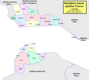В границах 1991 года, в состав общины Трново входило 63 населённых пункта, из которых по Дейтонскому соглашению 1995 года 25 населённых пунктов отошли к общине Трново Республике Сербской, а остальные 38 населённых пунктов отошли к общине Трново Федерации Боснии и Герцеговины.