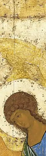 Но Лазарев подытоживает: «В свете новейших исследований можно определенно утверждать, что Рублёв не знал памятников итальянского искусства, а следовательно, и ничего не мог из них позаимствовать. Его главным источником была византийская живопись палеологовской эпохи, и притом столичная, константинопольская живопись. Именно отсюда почерпнул он элегантные типы своих ангелов, мотив склоненных голов, трапезу прямоугольной формы»[3].