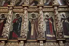 При реставрации в 1984 был комплексно воссоздан иконостас: 43 иконы середины XVII века, 25 — 1757 г., 2 — 1912 года. Разновременность икон является следствием реконструкции иконостаса в 1756—1758 годах, когда тябловый иконостас 1652 года был заменен барочным резным. При этом количество икон в рядах уменьшилось с 21 до 15, между иконами встали крупные колонки в виде вьющейся лозы с тучными гроздьями винограда. Иконостасную резьбу и позолоту выполнила артель большесольских резчиков под руководством Макара Быкова и Петра Золотарева. Иконы трех верхних ярусов были перенесены из прежнего иконостаса[11], а иконы местного и праздничного рядов были написаны в 1757 году Василием Никитиным Вощиным[12].