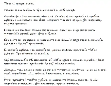 | Глас 2-й: | Чтец: «Вы́шния си́лы подража́юще на земли́, побе́дную песнь прино́сим Ти, Бла́же» Хор: «Свят, Свят, Свят еси́, Бо́же наш…» | Чтец: «Сла́ва Отцу́ и Сы́ну и Свято́му Ду́ху. Несозда́нное Естество́, всех Зижди́телю, устне́ на́ша отве́рзи, я́ко да возвести́м хвалу́ Твою́, вопию́ще» Хор: «Свят, Свят, Свят еси́, Бо́же наш, моли́твами всех святы́х Твои́х поми́луй нас.» | Чтец: «И ны́не и при́сно и во ве́ки веко́в. Ами́нь. От одра́ и сна воздви́гл мя еси́, Го́споди, ум мой просвети́ и се́рдце, и устне́ мои́ отве́рзи, во е́же пе́ти Тя, свята́я Тро́ице» Хор: «Свят, Свят, Свят еси́, Бо́же, Богоро́дицею поми́луй нас.» |