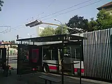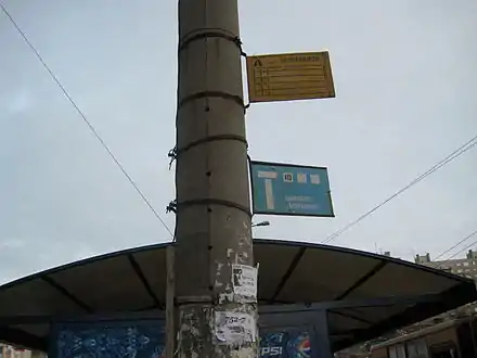 Таблички — «аншлаги» указывают, что здесь останавливается как автобус, так и троллейбус. Расписания отсутствуют, нанесён только номер маршрута троллейбуса и название остановки