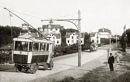 Первый троллейбус был создан в Германии инженером Вернером фон Сименсом, вероятно, под влиянием идеи его брата, проживавшего в Англии доктора Вильгельма Сименса, высказанной 18 мая 1881 года на двадцать втором заседании Королевского научного общества[14]. Электросъём осуществлялся восьмиколёсной тележкой (Kontaktwagen), катившейся по двум параллельным контактным проводам. Провода располагались достаточно близко друг от друга, и при сильном ветре нередко перехлёстывались, что приводило к коротким замыканиям. Экспериментальная троллейбусная линия протяжённостью 540 м (591 ярд), открытая компанией Siemens & Halske в предместье Берлина Галензе (Halensee), действовала с 29 апреля по 13 июня 1882[15].