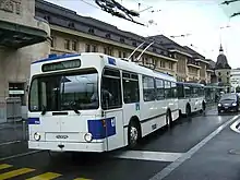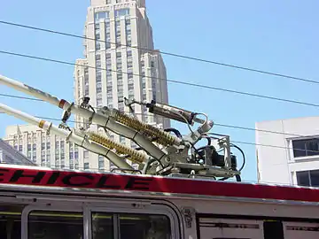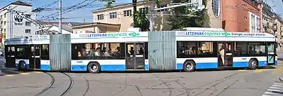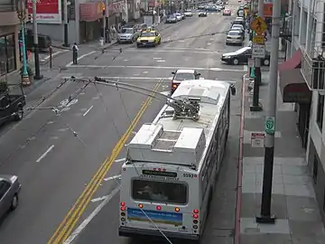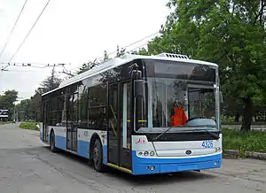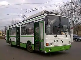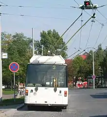 Тролле́йбус — безрельсовое механическое транспортное средство (преимущественно пассажирское, хотя встречаются троллейбусы грузовые и специального назначения[1]) контактного типа[1] с электрическим приводом, получающее электрический ток от внешнего источника питания (от центральных электрических станций)[1] через двухпроводную контактную сеть с помощью штангового токоприёмника[2] и сочетающее в себе как преимущества, так и недостатки трамвая и автобуса[3].