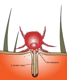 Кровососущие шестиногие личинки нападают на открытые участки кожи (лицо, ушные раковины, руки, подмышечные ямки, голени, бёдра, поясница, мошонка, ягодицы) при работе или прогулке летом. Чаще поражаются женщины и дети. Прилегающая одежда препятствует передвижению личинок, поэтому от укусов чаще всего страдают лодыжки. С помощью колющего хитинового прибора личинки внедряются в устья волосяных фолликулов и активно нарушают целостность кожных покровов. При этом их объект питания — не кровь, а клетки кожи. В коже хозяина под действием слюны личинок образуется стилостома (полый белковый канал, защищённый снаружи гиалином), через который они всасывают лимфу и межклеточную жидкость. Стилостома обладает сильными антигенными свойствами. Вокруг неё образуется очень сильно зудящая папула диаметром до 2 см; у сенсибилизированных лиц это происходит в течение нескольких часов[9]. Расчёсывание места укуса приводит к гибели личинки. В этом случае в центре папулы возникает везикула, а основание становится геморрагическим. Зуд и жжение держатся на протяжении нескольких недель. Нередко высыпания представлены пурпурозной инфильтрацией или лентикулярными пустулами, исчезающими через 3-4 недели и оставляющими после себя пигментацию.
