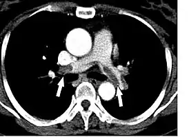 Диагностика трудна, так как симптомы ТЭЛА неспецифичны, а диагностические тесты несовершенны. Стандартные методы обследования (обычные лабораторные тесты, электрокардиография (ЭКГ), рентгенография органов грудной клетки) полезны только для исключения другой патологии (например, пневмонии, пневмоторакса, переломов рёбер, инфаркта миокарда, отёка лёгких). К чувствительным и специфичным методам диагностики ТЭЛА относят определение d-димера, эхокардиография, компьютерная томография (КТ), вентиляционно-перфузионная сцинтиграфия, ангиография сосудов лёгких, а также методы диагностики тромбоза глубоких вен нижних конечностей (ультрасонография, КТ-венография).[10]