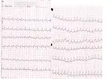 Признаки ТЭЛА на электрокардиограмме неспецифичны и у большинства больных отсутствуют[12]. Часто выявляют синусовую тахикардию, высокий и заострённый зубец P (P-pulmonale, признак перегрузки правого предсердия)[13]. Примерно у 20 % пациентов могут обнаруживаться признаки острого лёгочного сердца (перегрузки правого желудочка): отклонение электрической оси сердца вправо; синдром SIQIIITIII (синдром МакГинна-Уайта[14]) — глубокий зубец S в I отведении, выраженный зубец Q и отрицательный зубец T в III отведении; новая блокада правой ножки пучка Гиса; глубокие зубцы S в V5-6 в сочетании с отрицательными зубцами T в V1-4[15]. Однако острое лёгочное сердце может возникать и при других острых патологиях дыхательной системы (массивная пневмония, тяжёлый приступ бронхиальной астмы)[16].