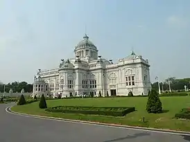 Строительство здания началось в 1906 году по приказу короля Чулалонгкорна (Рамы V), но было завершено только в 1915 году, когда король уже умер (его наследник Вачиравуд издал отдельный указ об обязательном продолжении строительства). Бюджет строительства составил 15 миллионов батов. Архитекторами здания были Марио Таманьо и Аннибале Риготти, наблюдающим с сиамской (как тогда назывался Таиланд) стороны — Яма Чао; в качестве основного строительного материала использовался итальянский каррарский мрамор, здание строилось в стиле итальянского неоренессанса с элементами неоклассики[2]. Внутренние стены здания и потолок купола расписаны фресками работы Галилео Чини и Карло Риджули, на которых изображены различные сцены из истории династии Чакри — от Рамы I (Буддха Йодфа Чулалоке), первого короля Сиама, совершившего успешный поход в Камбоджу, до Рамы VI (то есть взошедшего тогда на престол Вачиравудха). Во время революции 1932 года здание служило штабом Народной партии.