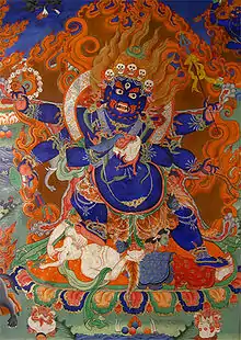 У каждой из трех фигур, а также у ноги тибетского божества Махакалы XII в. есть свой трон