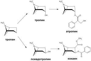 Наиболее известными представителями тропановых алкалоидов являются атропин, содержащийся в белладонне, скополамин в дурмане семейства паслёновых и кокаин коки семейства эритроксиловых.