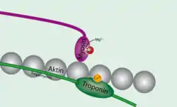 И сердечная, и скелетные мышцы управляются с помощью изменения внутриклеточной концентрации кальция. Когда концентрация возрастает, мышцы сокращаются, а когда падает — расслабляются. Тропонин — комплекс белков, к которому присоединяется кальций, управляя его структурой, компонент тонких мышечных филаментов (вместе с актином и тропомиозином), располагается на тропомиозине с промежутками, длина которых равна длине тропомиозина (40 нм). Тропонин состоит из трех белков: тропонина C, тропонина I и тропонина T. Когда кальций присоединяется к определенным местам белка тропонина C, тропомиозин сдвигается с активных мест на актине, таким образом, что миозин (молекулярный мотор, образующий толстые мышечные волокна) может присоединиться к актиновому волокну и, создав силу, произвести движение. В отсутствие кальция тропомиозин служит препятствием для миозина, и мышца остается расслабленной.