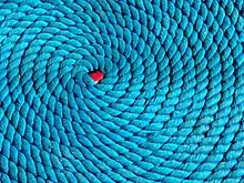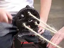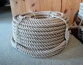 - Верёвка (устар. «вервь, ве́рвие, воро́вина, ужи́ще») — самое общее название свитой или спущенной в несколько прядей толстой нити, обычно пеньковой; каждую прядь скручивают сначала отдельно из ка́болки, а затем 3, иногда 4 пряди скручивают («спускают») вместе. Толщина верёвки разнится от бечёвки в гусиное перо до якорного каната; но у моряков этого слова нет, а есть «линь», «фал», толще — «конец», «трос»; верёвка на судне — «снасть»; самая толстая — «кáбельтов, пéрлинь»; якорная верёвка — «канáт» (на Волге — «шейма»); бегучий конец снасти — «лопарь». Кроме пеньковой бывают: мочальные верёвки, на белянах — лычага, из грив и хвостов с шерстью — аркан; турецкие бумажные, китайские шёлковые; для висячих мостов «спускают» и проволочные; также травяные, кокосовые и из других волокон, жильные[3]