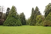 Особое место занимают хвойные растения, которыми засажены наиболее рельефные места парка, они удачно использованы при оформлении полян, прудов, отдельных парковых массивов. Благодаря хвойным видам необычный художественный колорит создается в парке в течение летнего периода и зимой. Низкорослый можжевельник казацкий, которым покрыты крутые склоны, горки и их подножия и берега прудов, эффективно выполняет почвозащитную функцию, не допуская смывов и эрозии почвенной поверхности. Высокорослые виды рода туя, пихта, ель, сосна и другие с их чрезвычайно декоративными голубыми, серебристыми, золотистыми, плакучими, пирамидальными и пологими формами использованы для создания живописных пейзажей в виде отдельных групп или одиночных экземпляров на открытых местах. Здороваясь с парком, посетитель встречается с Вестибюльной поляной, шагая вдоль берега Большого пруда — с поляной Шевченко, потом открываются Тисовые, Кедровая, Березовая лужайки и поляны огромных туй, такие как «Три сестры» и «Восемь братьев». Центральный мост через Большой пруд ведёт к «Швейцарскому» ущелью и вершинам рукотворных гор: Косматый, Сторожевой, Дедова, Ротонда, где встречаются скифские каменные бабы. Возле мраморного памятника, который заказал хозяин парка И. М. Скоропадский незадолго до смерти, начертаны обращённые к посетителям слова: «Любезный прохожий! Сад, в котором ты гуляешь, посажен мной; он служил мне утешением в моей жизни. Если ты заметишь беспорядок, ведущий к уничтожению его, то скажи об этом хозяину сада: ты сделаешь доброе дело».