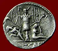 Многочисленные монеты, реже греческие, главным образом римские, выпущенные в ознаменование чьей-либо победы, часто имели на одной стороне профиль полководца, а на другой — трофей, как знак победы, иногда вместе с предметами для жертвоприношения и связанными пленными, к тому же в сочетании с богиней победы Викторией (воздвигающая или украшающая трофей, пишущая весть о победе на щите и т. п.).