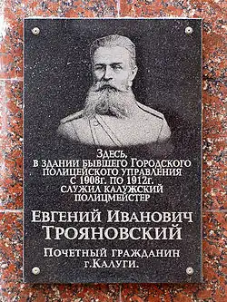 - Торжественное открытие мемориальной доски, посвящённой памяти первого главного калужского полицмейстера Е. И. Трояновского. Управление Судебного департамента в Калужской области (13 ноября 2008). Дата обращения: 1 октября 2014.