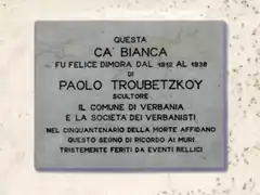 «Этот «Белый дом» был счастливым жилищем скульптора Паоло Трубецкого с 1912 по 1938 год. Муниципалитет Вербании и Общество вербанистов к 50-летию его смерти установили этот памятный знак на стены, пострадавшие от военных событий.»