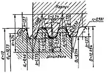 Дюймовая резьба с углом профиля при вершине 55°, теоретическая высота профиля Н = 0,960491Р.