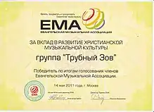 Только в 2011 году группа «Трубный Зов» получила официальное признание от Евангельской Музыкальной Ассоциации (ЕМА). Пастора Сергея Тимохина пригласили выступить с его новой церковной группой в Москве, где ему вручили грамоту «За вклад в развитие христианской музыкальной культуры», копию которой Сергей переправил Валерию Баринову в Лондон.