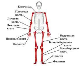 К длинным трубчатым костям относятся бедренная, большеберцовая и малоберцовая кости; плечевая, локтевая и лучевая кость. К коротким трубчатым костям относят пястные и плюсневые кости, а также фаланги пальцев. Длинные кости нижних конечностей составляют приблизительно половину роста человека.