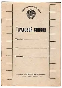 Трудова́я кни́жка — официальный персональный документ, содержащий записи о трудоустройстве гражданина. В Европе известны с конца XVIII века (Франция; там же и появилось название документа, фр. livret d'ouvrier). В СССР трудовые списки (трудовые книжки) введены взамен дореволюционных послужных списков, охватывавших лишь некоторые категории граждан.