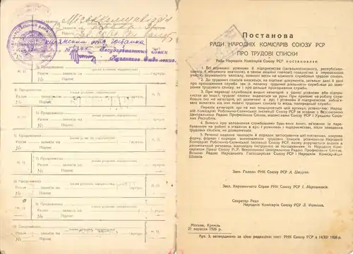21 сентября 1926 года постановлением Совета Народных Комиссаров СССР взамен трудовых книжек были введены «Трудовые списки».