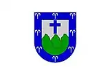На гербе изображен щит с синей каймой, на которой изображены восемь струй воды, символизирующие собой множество рек и ручьёв, протекающие в городе. Внутри щита находится серебряное поле с тремя зелёными горами и синим латинским крестом над ними.