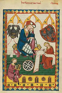 Изображение трёхглавого орла с двумя головами на концах крыльев использовал в качестве герба немецкий поэт Рейнмар фон Цветер (1200—1248). Иллюстрация из Манесского кодекса (ок. 1300 г.).