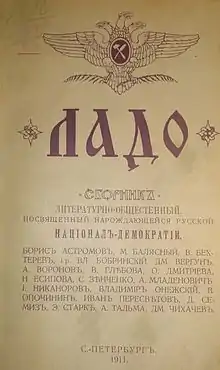 - Трёхглавый орёл был изображён на обложке национал-демократического литературно-общественного сборника «Ладо» (СПб, 1911). Сборник открывало стихотворение «Славянский орёл» Д. Н. Вергуна, в котором объяснялось, что такой орёл символизирует объединение «трёх рас». Средняя голова — «славянская стезя», «восточная» — «монгольская тропа» и «западная» — «варяжская волна»[24].
