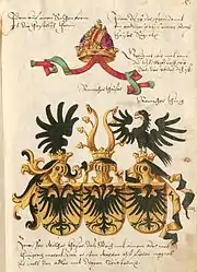 Герб для императора Священной Римской империи Фридриха III, разработанный Конрадом Грюненбергом в 1483 году[9]. Одноглавый орёл символизирует Германию, двуглавый — Священную Римскую империю, а трёхглавый — Рим[10].