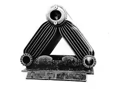 Водопроводные трубы заполняют две стороны этого треугольника между барабанами, и печь находилась в центре конструкции. Весь агрегат потом собирался в кожух, на горе размещались дымогарные трубы.