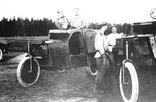 ![]() Пулемётные бронеавтомобили Филатова («Трёхколёски») на полигонных испытаниях. 1916 год. | |
