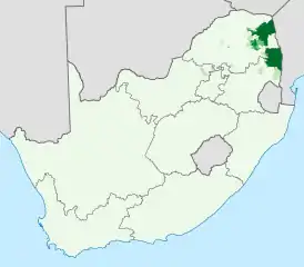 ![]() Распространение свати в ЮАР, доля населения, говорящего на тсонга дома: 0–20% 20–40% 40–60% 60–80% 80–100% | |