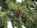 Женские шишки фиолетовые, в созревающем состоянии серо-коричневые либо тёмно-серо-коричневые, яйцевидно-цилиндрические, 3—6 см длиной, 1,5—2,5 см толщиной. Чешуйки шишки пушистые, расходятся широким веером, 8—11 мм длиной, окончания острые или закруглённые.