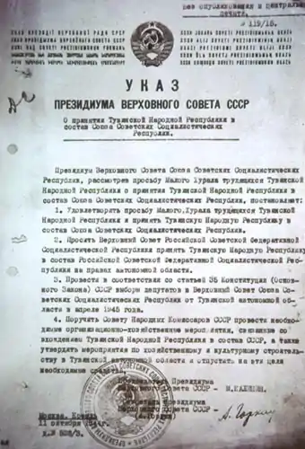 - Указ Президиума Верховного Совета СССР от 11 октября 1944 г. «О принятии Тувинской Народной Республики в состав Союза Советских Социалистических Республик»